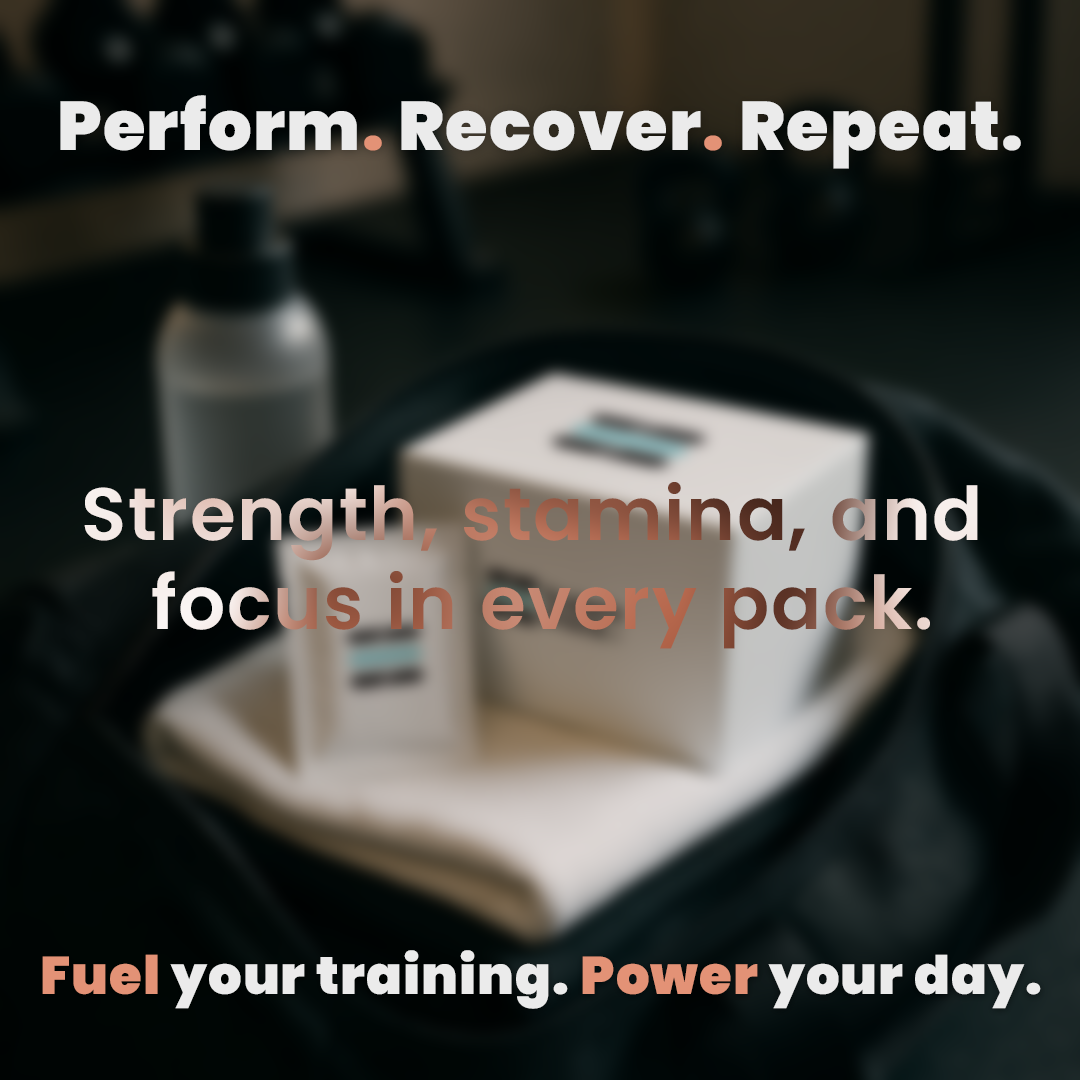 Each daily sachet blends Ashwagandha (KSM-66), CoQ10, D3, high-potency B-Complex, Magnesium, Zinc, and Omega-3 — everything you need for steady, stimulant-free performance.